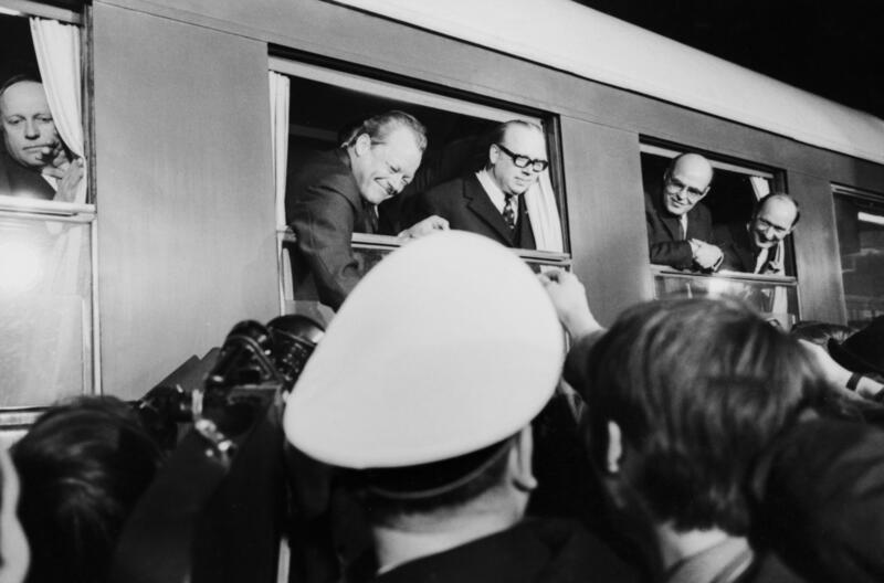 Bundeskanzler Willy Brandt beugt sich aus dem Zugfenster und schüttelt mit einem strahlenden Lächeln die Hände zahlreicher Erfurter Bürger. Neben ihm Mitglieder der Delegation, ebenfalls am Fenster. Das Foto fängt die mit Spannung geladene und zugleich herzliche Stimmung bei Brandts Besuch in der DDR ein.Am 19. März 1970 verlassen Bundeskanzler Willy Brandt (links) und DDR-Ministerratsvorsitzender Willi Stoph (rechts) gemeinsam den Erfurter Hauptbahnhof.Bundeskanzler Willy Brandt beugt sich aus dem Zugfenster und schüttelt mit einem strahlenden Lächeln die Hände zahlreicher Erfurter Bürger. Neben ihm Mitglieder der Delegation, ebenfalls am Fenster. Das Foto fängt die mit Spannung geladene und zugleich herzliche Stimmung bei Brandts Besuch in der DDR ein.Willy Brandt gibt der BILD-Journalistin Ingrid Gallmeister während des Flugs von Köln nach Moskau Feuer. Die Aufnahme zeigt den Bundeskanzler und die Reporterin in einem privaten Moment an Bord der Lufthansa-Maschine auf dem Weg zum Abschluss des Moskauer Vertrags.Willy Brandt gratuliert auf dem Roten Platz in Moskau einem frisch vermählten Brautpaar. Der Bräutigam schüttelt dem Bundeskanzler die Hand, während die Braut mit Blumenstrauß lächelt, im Hintergrund halten Pressefotografen und Kameraleute den Moment fest.Im Katharinen-Saal des Moskauer Kremlpalasts erklärt Leonid Breschnew, Generalsekretär der KPdSU, dem deutschen Bundeskanzler Willy Brandt die historischen und architektonischen Besonderheiten des Raumes. Umgeben von weiteren Delegationsmitgliedern blicken beide Staatsmänner in Richtung der Decke oder auf ein kunsthistorisches Detail.Warschau, 7. Dezember 1970: Bundeskanzler Willy Brandt (hinten) und Polens Ministerpräsident Jozef Cyrankiewicz (vorn) während der offiziellen Gespräche zur Unterzeichnung des Warschauer Vertrags. Aufnahme im doppelten Profil.Warschau, 7. Dezember 1970: Bundeskanzler Willy Brandt (rechts) verabschiedet sich mit einem Händedruck von Polens Partei- und Staatschef Wladyslaw Gomulka (Mitte), daneben Ministerpräsident Jozef Cyrankiewicz (links) – nach der Unterzeichnung des Warschauer Vertrags.Warschau, 7. Dezember 1970: Bundeskanzler Willy Brandt (links) im Gespräch mit einem Dolmetscher und Polens Partei- und Staatschef Wladyslaw Gomulka (rechts) während der diplomatischen Begegnungen zum Warschauer Vertrag.